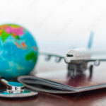Das Wort Reisemedizin wird auf einer Schiefertafel gezeigt und von einer Person mit Arztkittel und Stethoskop gehalten.